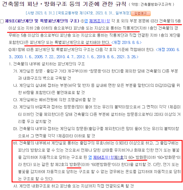 5층 이상 또는 지하 2층 이하의 층으로부터 피난층 또는 지상으로 통하는 직통계단은 60+방화문 설치