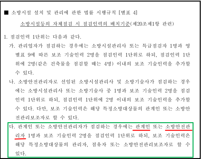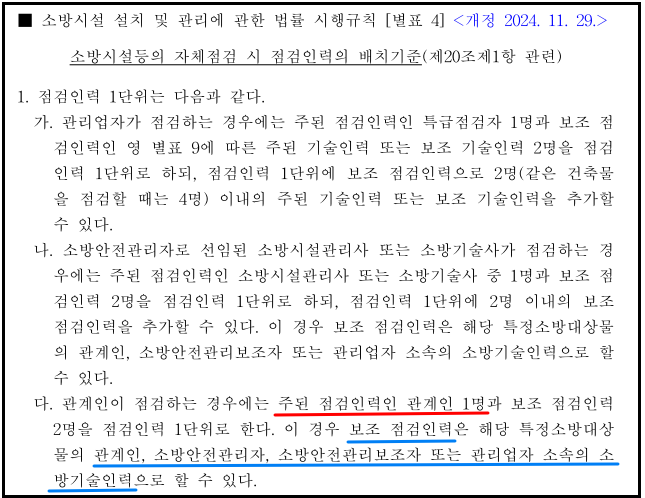 - 주된 점검인력 = 관계인 1명(필수)