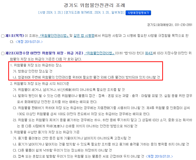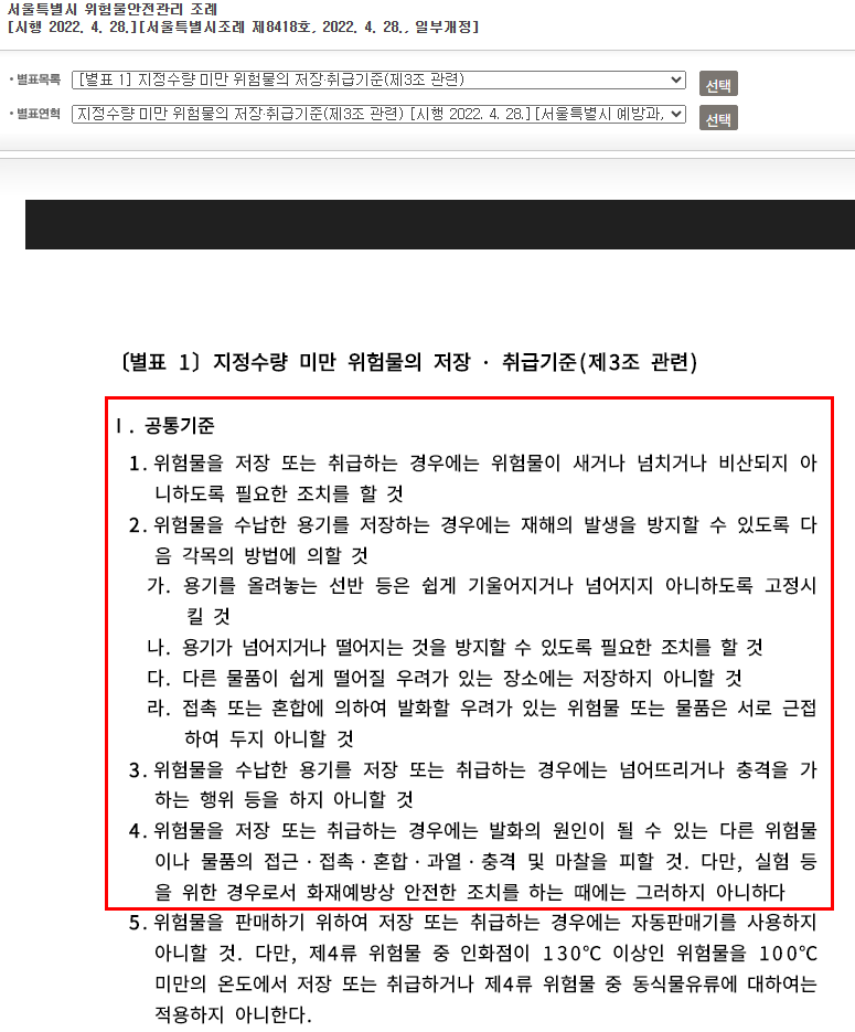 지정수량 미만(예: 4L 용기 등)의 위험물이라 하더라도 수도권 지자체는 각기 다른 조문을 통해 이를 엄격히 규제하고 있습니다.